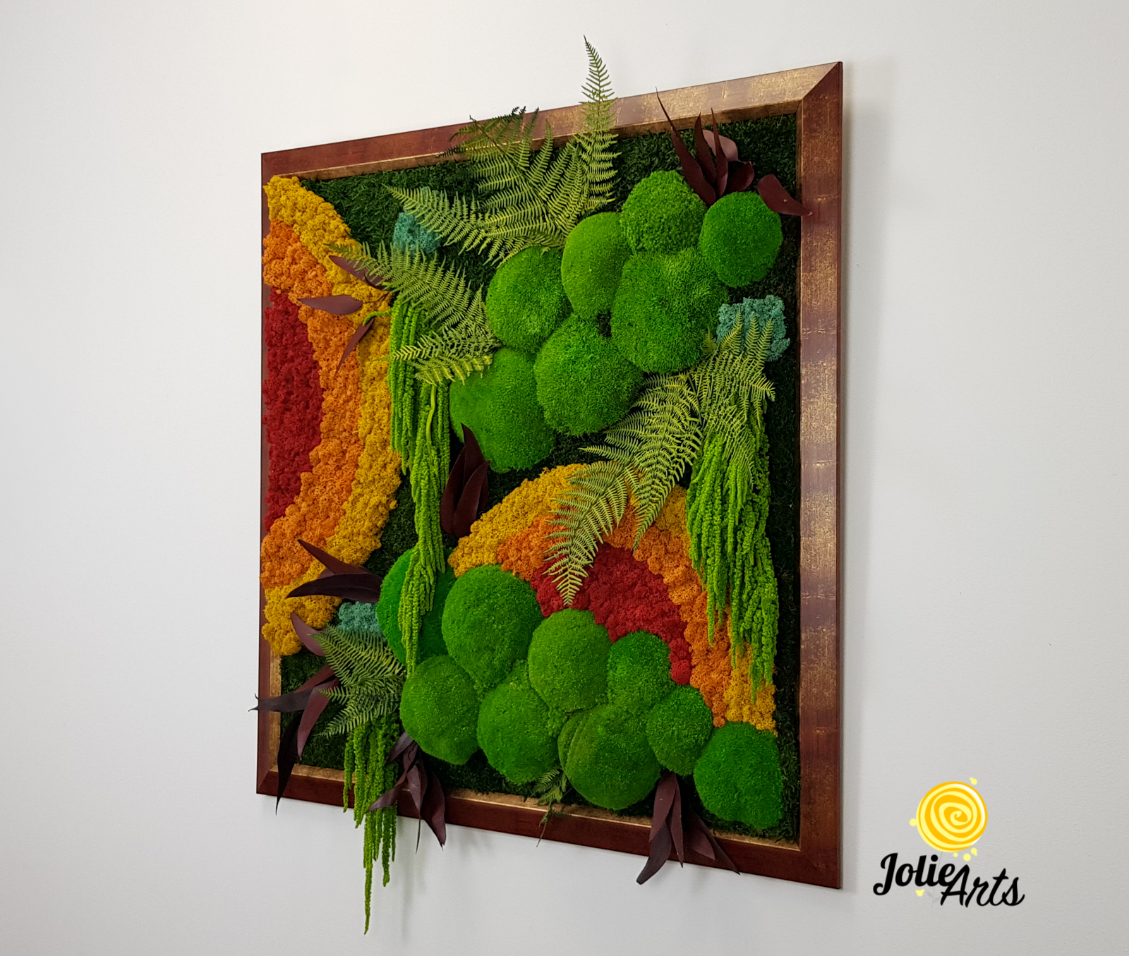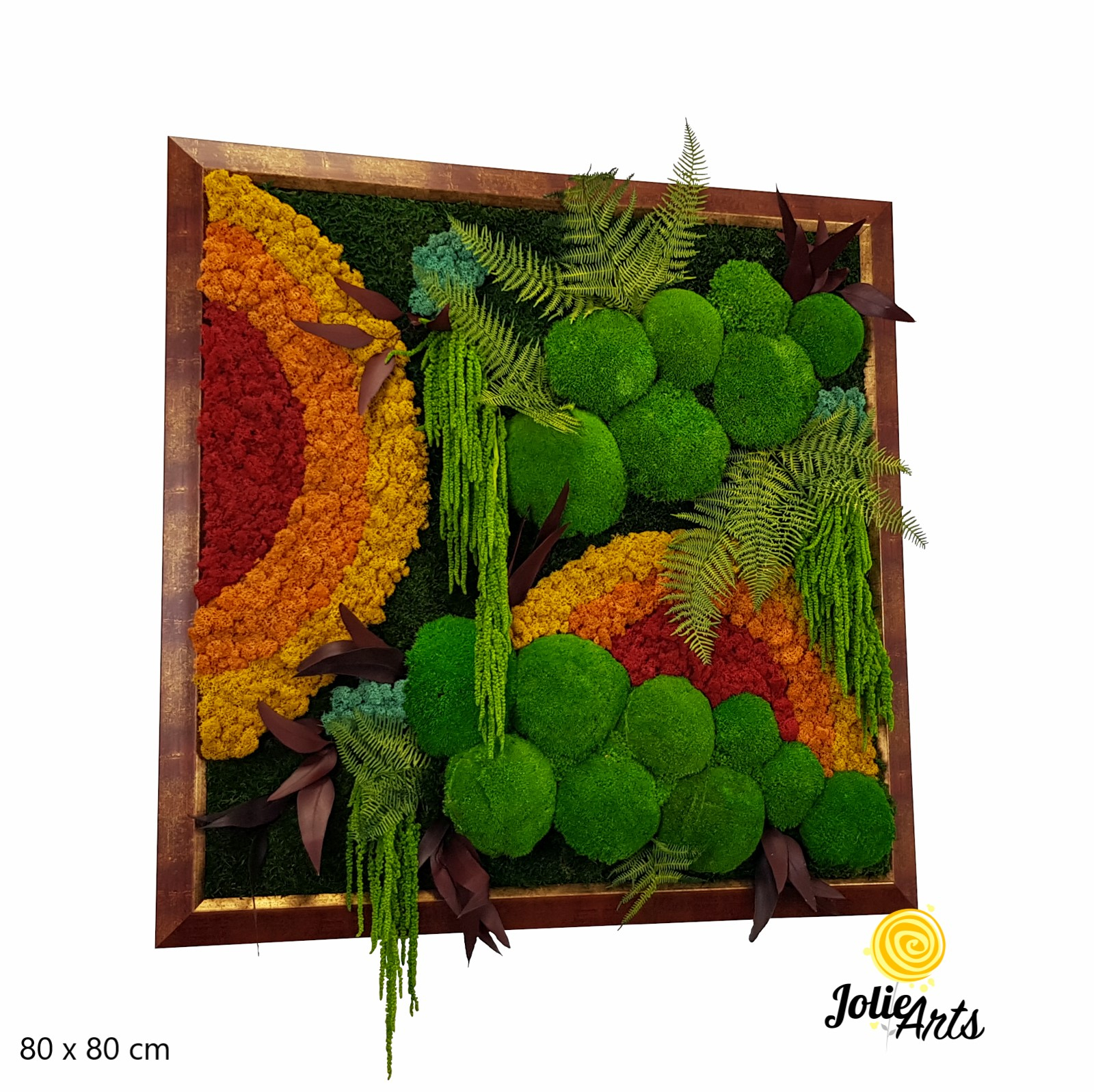 Modelul Curcubeu rămâne un simbol al bucuriei și al armoniei, surprins în acest tablou deosebit, realizat manual din licheni naturali stabilizați, mușchi de pădure și plante conservate atent selecționate. Tabloul transmite o energie pozitivă prin culorile sale vibrante, ce includ nuanțe intense de roșu, galben și portocaliu, îmbinate cu texturi bogate de mușchi plat și bombat, completate de frunze de eucalipt, amaranthus și ferigă.