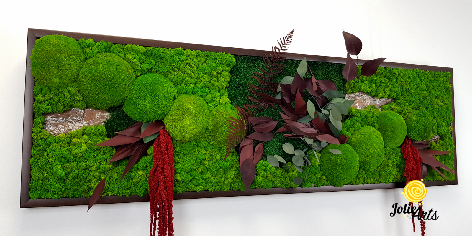 Tablou decorativ Amaranthus Roșu, lucrat manual din licheni naturali, mușchi bombat și inserții de plante stabilizate. Culoarea roșie vibrantă și contrastul cu verdele mușchiului creează un accent vizual de impact, ideal pentru spații moderne sau clasice. Formatul generos este potrivit pentru pereți lungi, coridoare și încăperi cu tavan înalt.