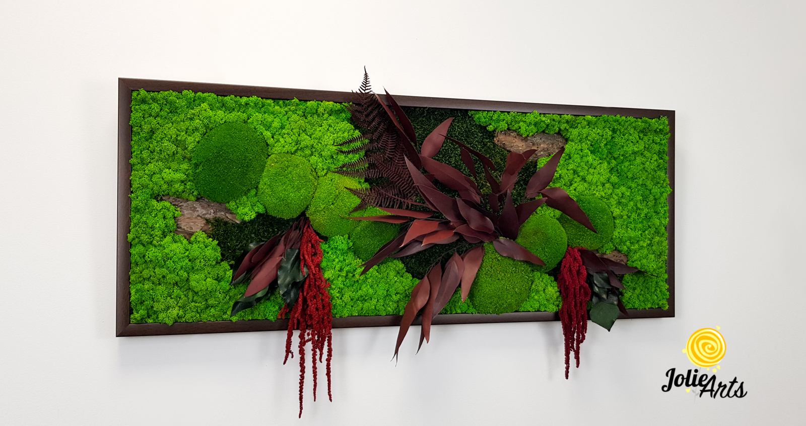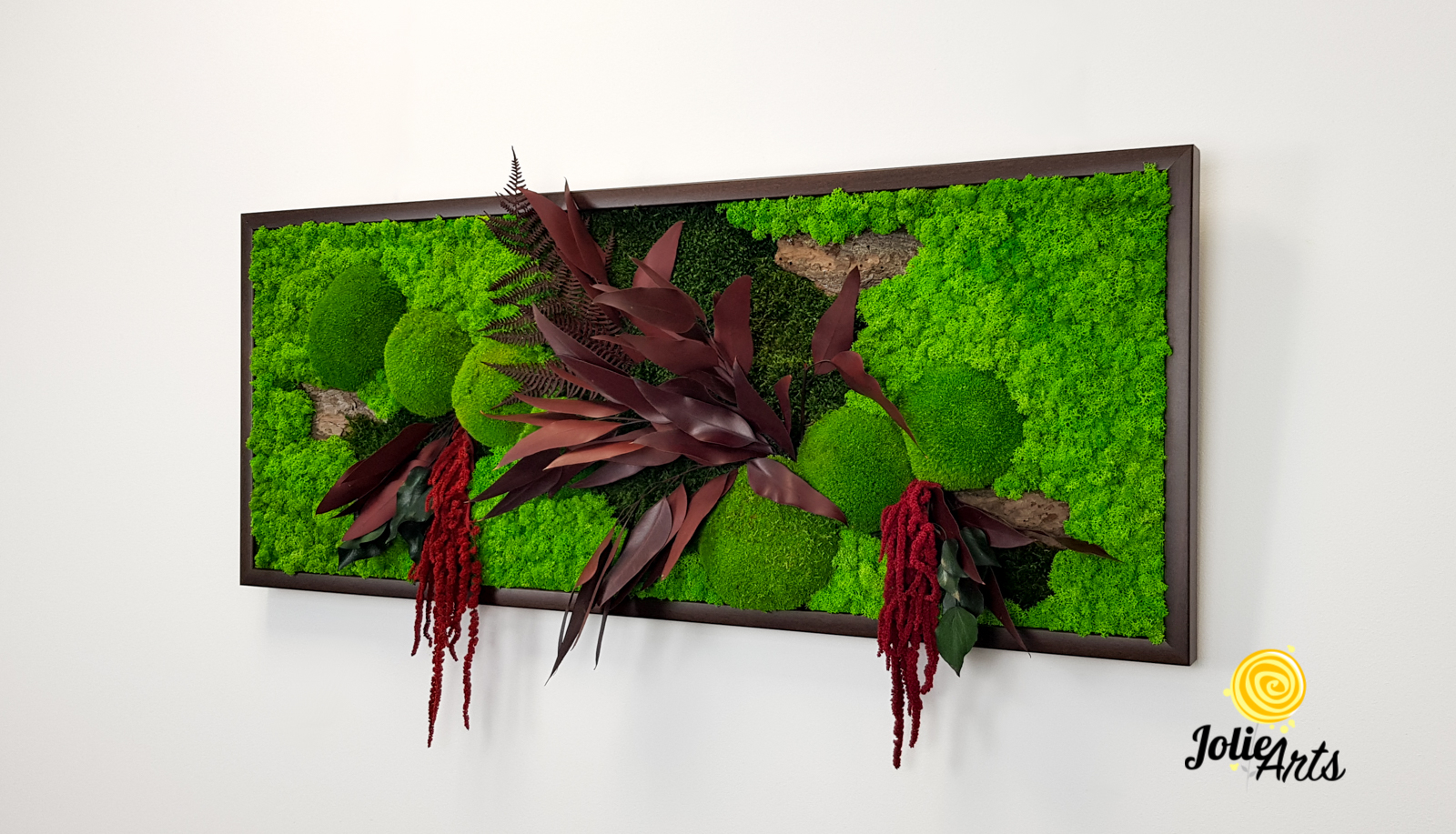 Tablou decorativ Amaranthus Roșu, lucrat manual din licheni naturali, mușchi bombat și inserții de plante stabilizate. Culoarea roșie vibrantă și contrastul cu verdele mușchiului creează un accent vizual de impact, ideal pentru spații moderne sau clasice. Formatul generos este potrivit pentru pereți lungi, coridoare și încăperi cu tavan înalt.