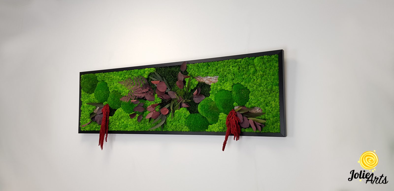 Tablou decorativ orizontal realizat manual din licheni naturali, mușchi bombat și plat, cu inserții de amaranthus roșu intens. Contrastul dintre verdele mușchiului și roșul vibrant al amaranthusului oferă energie vizuală și creează o piesă decorativă cu personalitate puternică.
