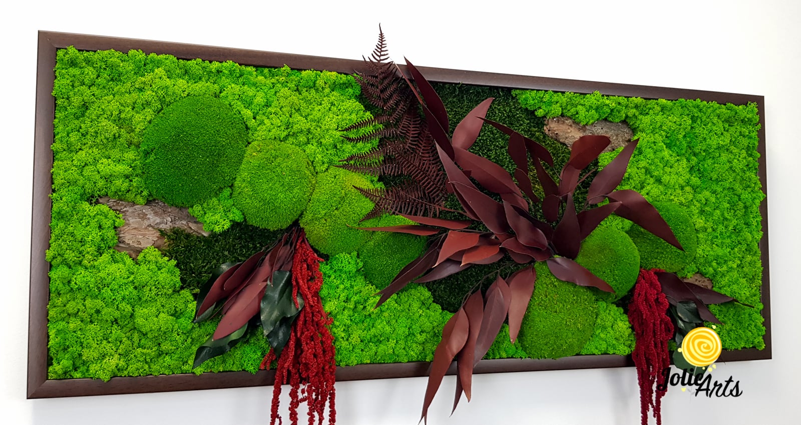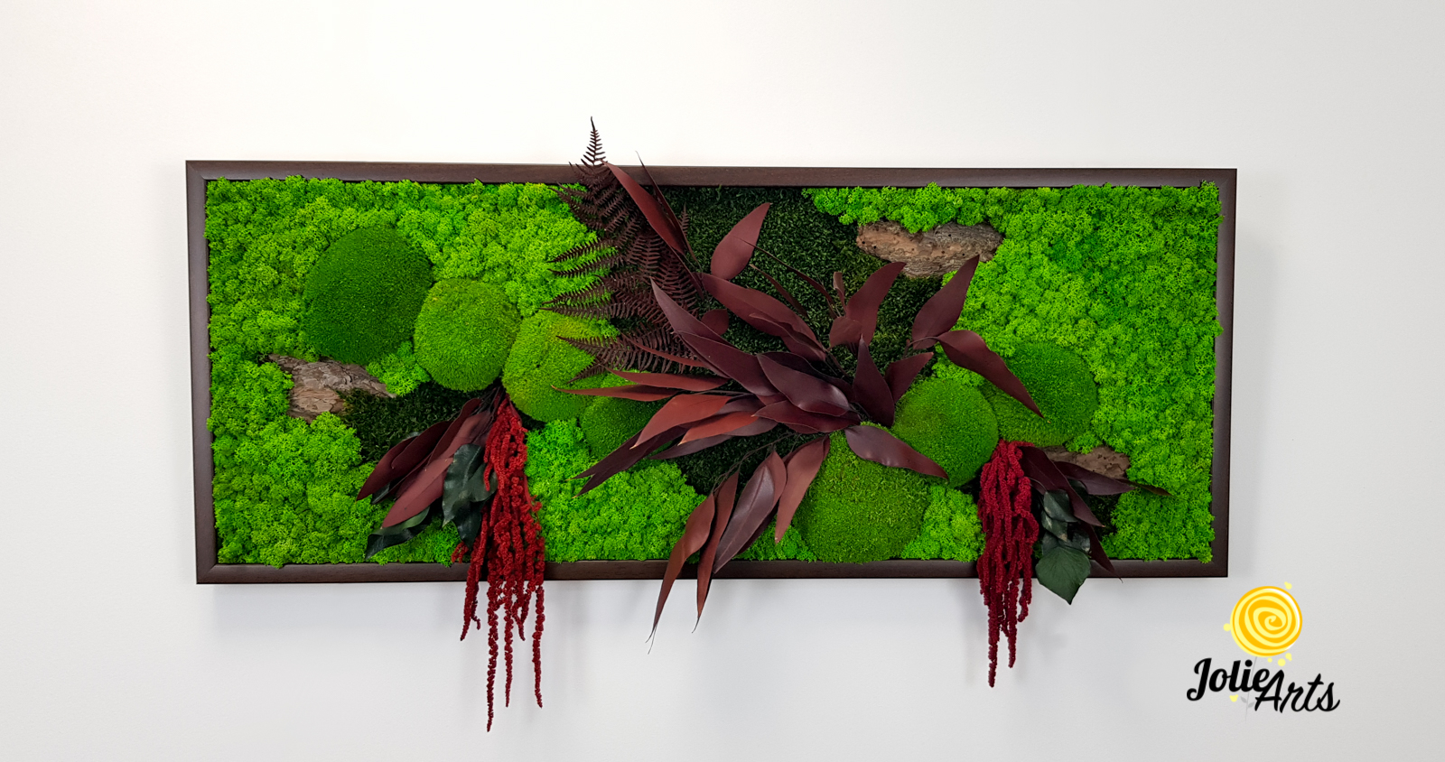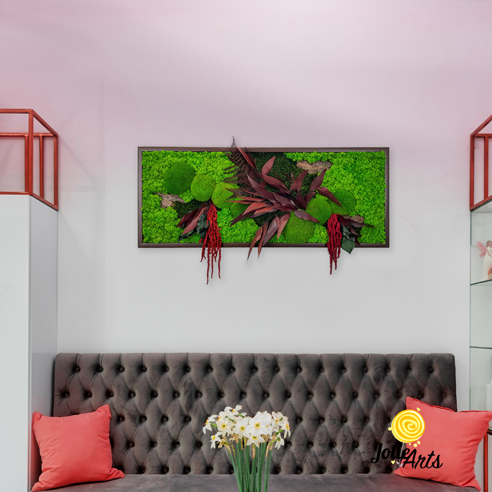 Tablou decorativ cu design orizontal, realizat manual din licheni naturali stabilizați, mușchi bombat și plat și un accent puternic de amaranthus roșu intens. Acest model este perfect pentru a oferi o pată de culoare vie și un impact vizual puternic în orice decor modern sau clasic reinterpretat.