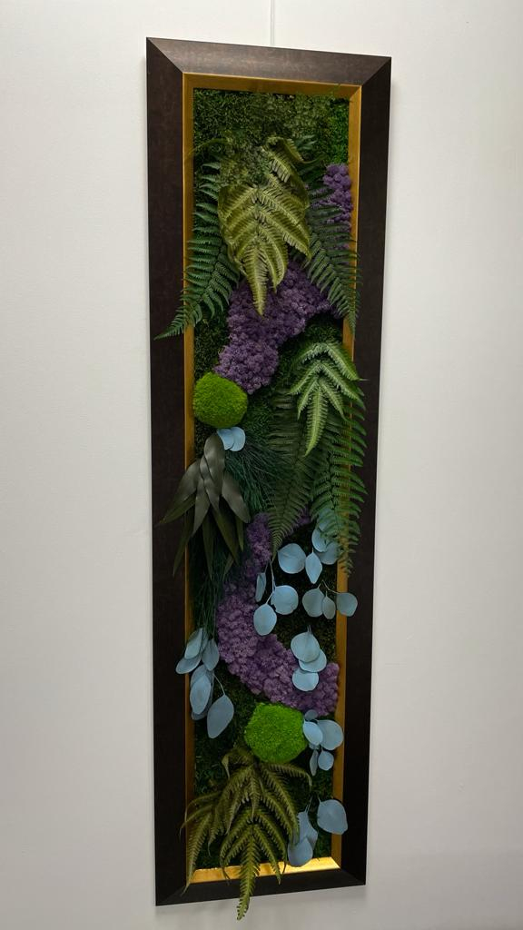 Tablou natural decorativ, realizat manual dintr-o compoziție echilibrată de licheni stabilizați, mușchi bombați și plati, alături de plante naturale stabilizate precum feriga, eucaliptul și alte inserții decorative. Modelul Amazon este inspirat de vegetația luxuriantă și de contrastul viu al junglei tropicale, fiind ideal pentru amenajări moderne, creative și naturale.