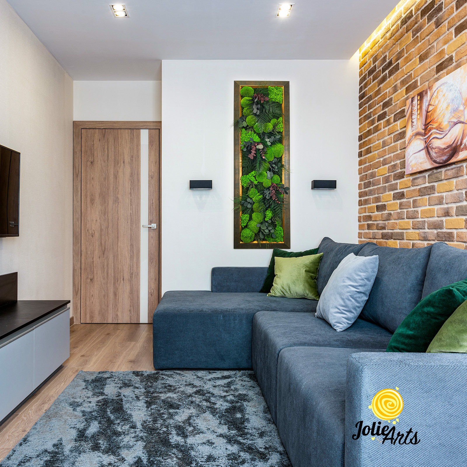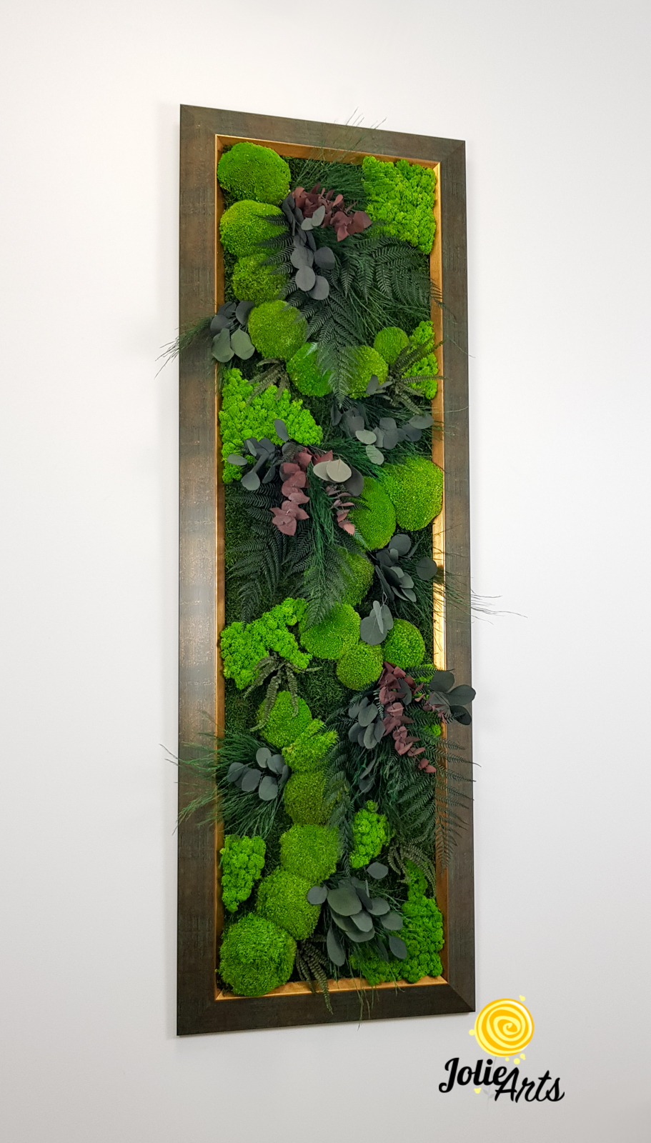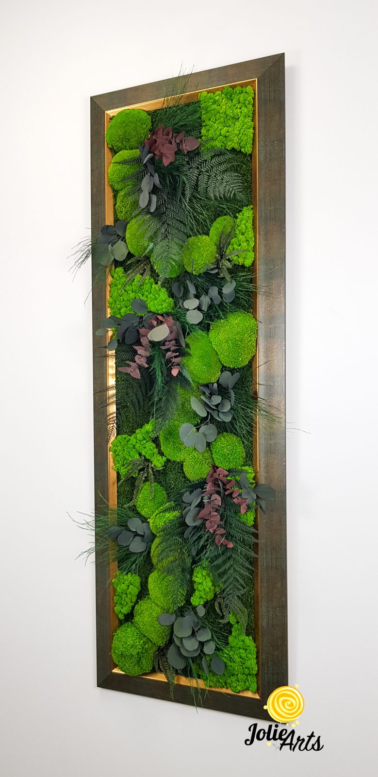 Jolie Arts Tablou Model Island – Design Vertical, Licheni, Mușchi și Plante Naturale Stabilizate, Ramă Patinată cu Inserții Aurii