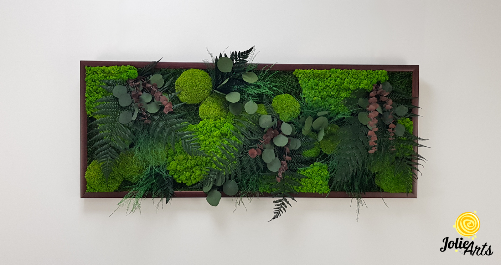 Textura unică a lichenilor și volumul mușchiului bombat se îmbină armonios cu eucaliptul și ferigile atent selecționate, evocând senzația de intimitate și adăpost a unei insule paradisiace. Acest tablou poate fi adaptat în funcție de dimensiune și rama aleasă, potrivindu-se astfel perfect cu stilul oricărui spațiu: living, birou sau recepție.