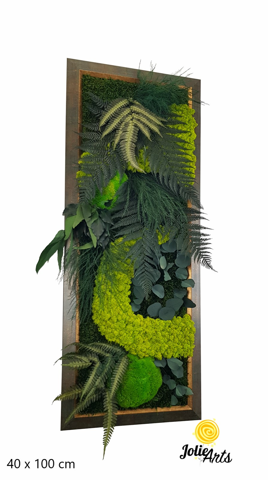 Acest tablou vertical din gama Amazon este realizat manual cu licheni stabilizați, mușchi bombat și plat, eucalipt și ferigi, toate aranjate armonios pentru a recrea atmosfera luxuriantă și autentică a pădurilor tropicale amazoniene. Designul vertical pune în valoare textura bogată și culorile naturale, transformând orice perete într-un punct de interes.