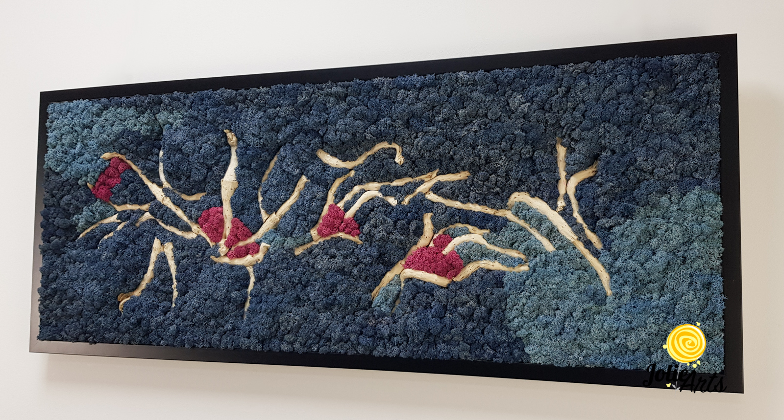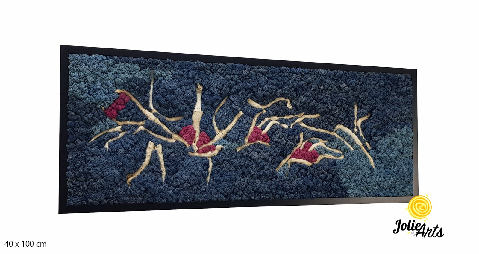 Un model inspirat de vibrația mării și a peisajelor mediteraneene, tabloul Mediteranean este realizat manual din licheni naturali stabilizați în două nuanțe de albastru, creând profunzime și un efect vizual liniștitor. Accentele roz adaugă eleganță, iar inserțiile de lemn natural tip topy oferă textură, ritm și autenticitate compoziției.