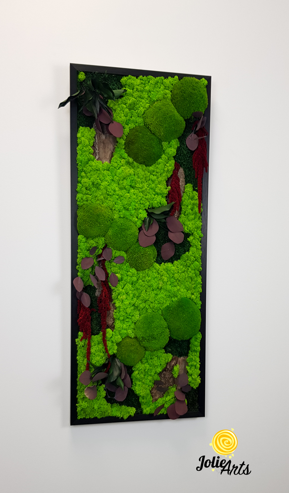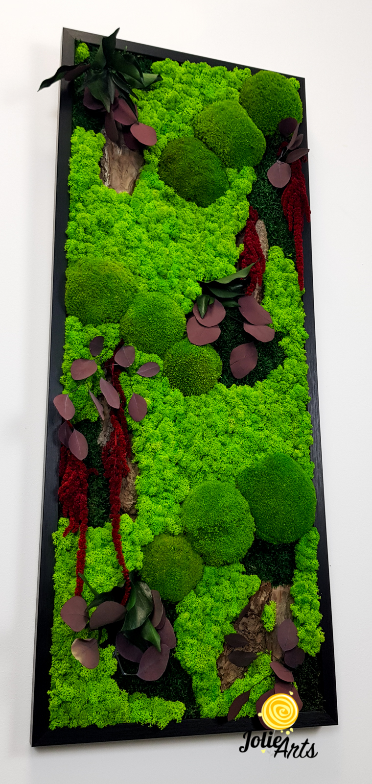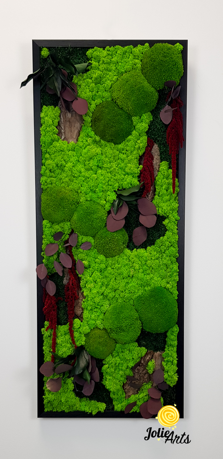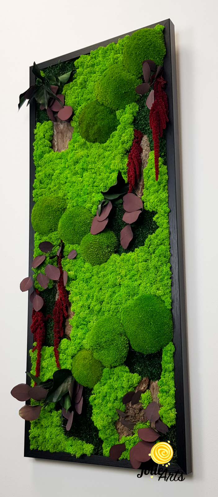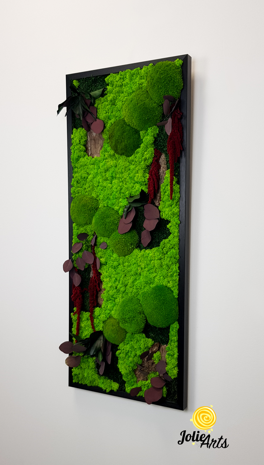 Tabloul vertical Amaranthus Burgundy aduce un plus de rafinament și culoare caldă în orice spațiu interior. Realizat manual din licheni naturali stabilizați, mușchi bombat și plat și inserții de amaranthus într-o nuanță burgundy elegantă, acest decor natural este soluția ideală pentru a aduce natura mai aproape, fără întreținere.