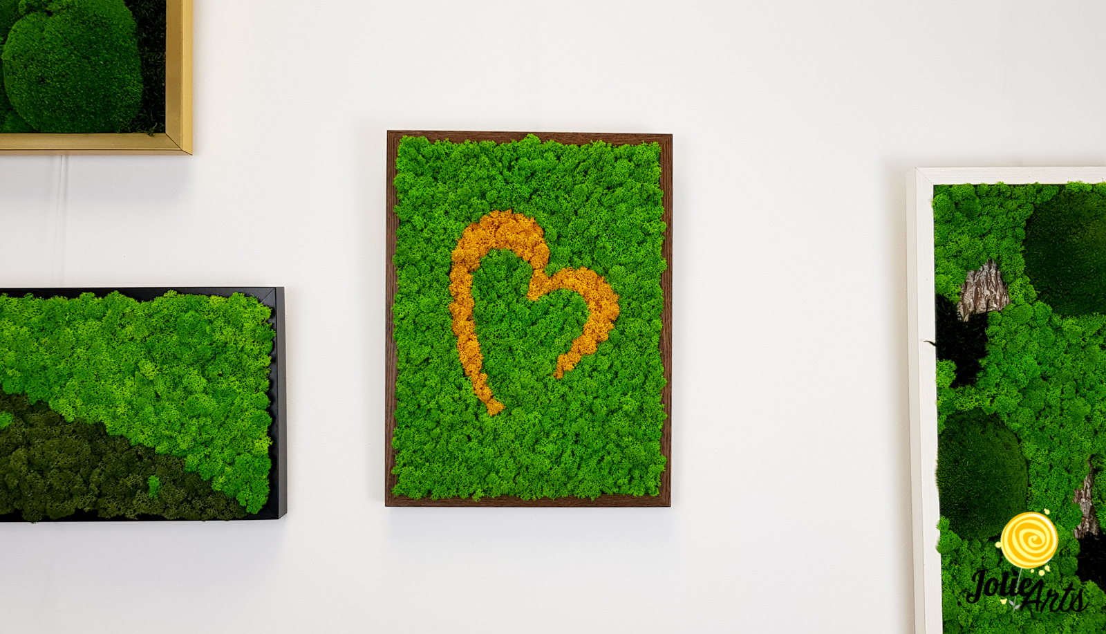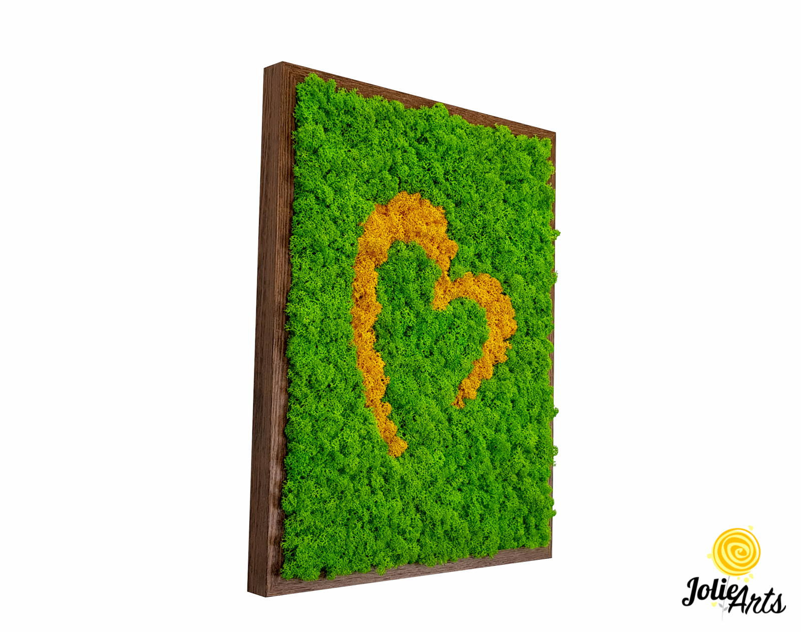 Tablou decorativ realizat manual din licheni naturali stabilizați, cu o inimă stilizată creată din licheni galbeni pe fundal verde intens. Modelul aduce un accent viu, pozitiv și natural în orice spațiu – de acasă sau de la birou.
